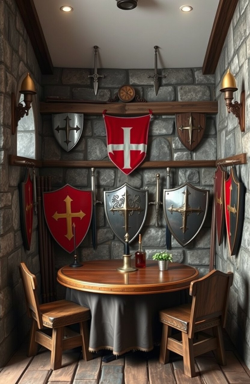 Turn a corner into a knight’s hall with shields and swords. Add a round table for knightly gatherings.