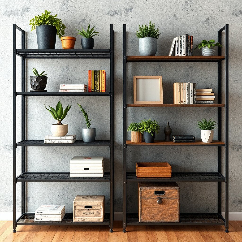 Organize with style using metal shelving units. They’re perfect for displaying books, plants, or collectibles.