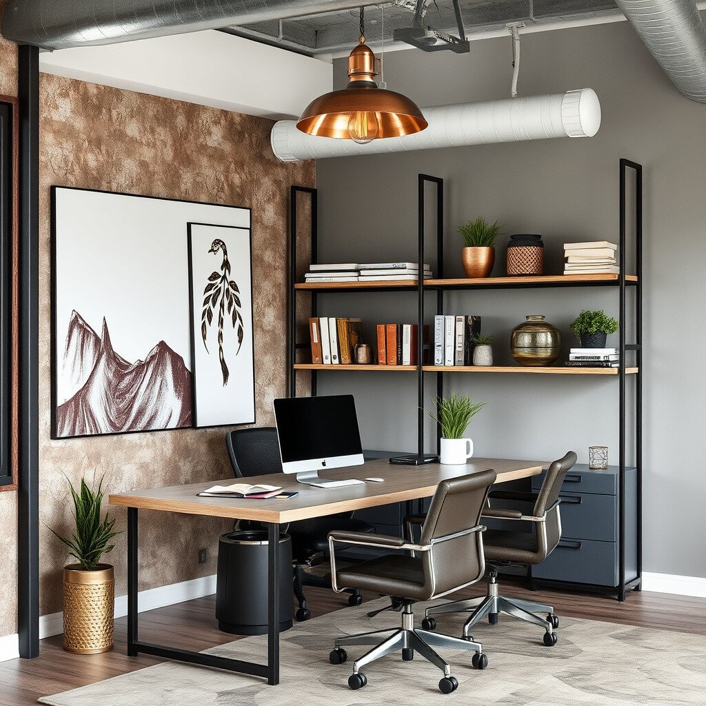 Metal accents can bring a gleaming touch to your office design. Think steel, iron, and copper elements like shelves, frames, and light fixtures. They add a sleek, modern look that perfectly complements an industrial theme.