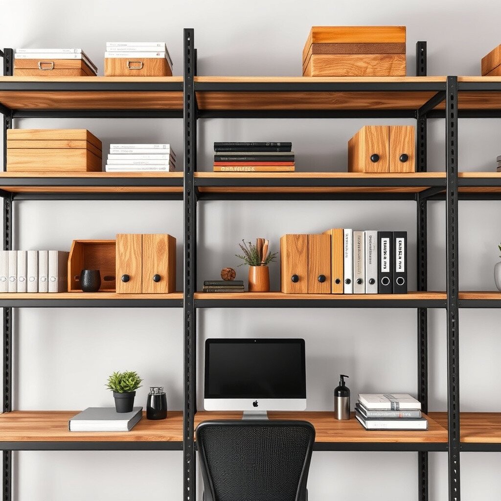 Industrial shelving combines form and function. Open shelves with metal frames and wood planks offer a practical and stylish way to organize your office. They provide easy access to materials while showcasing your design sensibility.