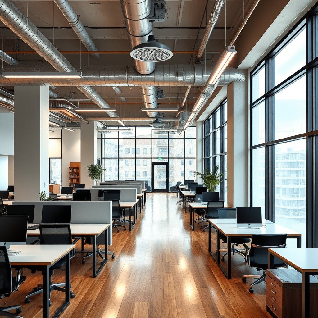An open floor plan fosters collaboration and communication. It aligns perfectly with industrial design, as it enhances the sense of space and light. This layout encourages a dynamic and interactive work environment.