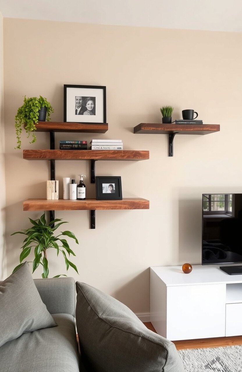 This shelf is unique because it brings that industrial charm into your living room. It can hold heavier items, making it functional for storage, too. Consider using reclaimed wood for an eco-friendly option.