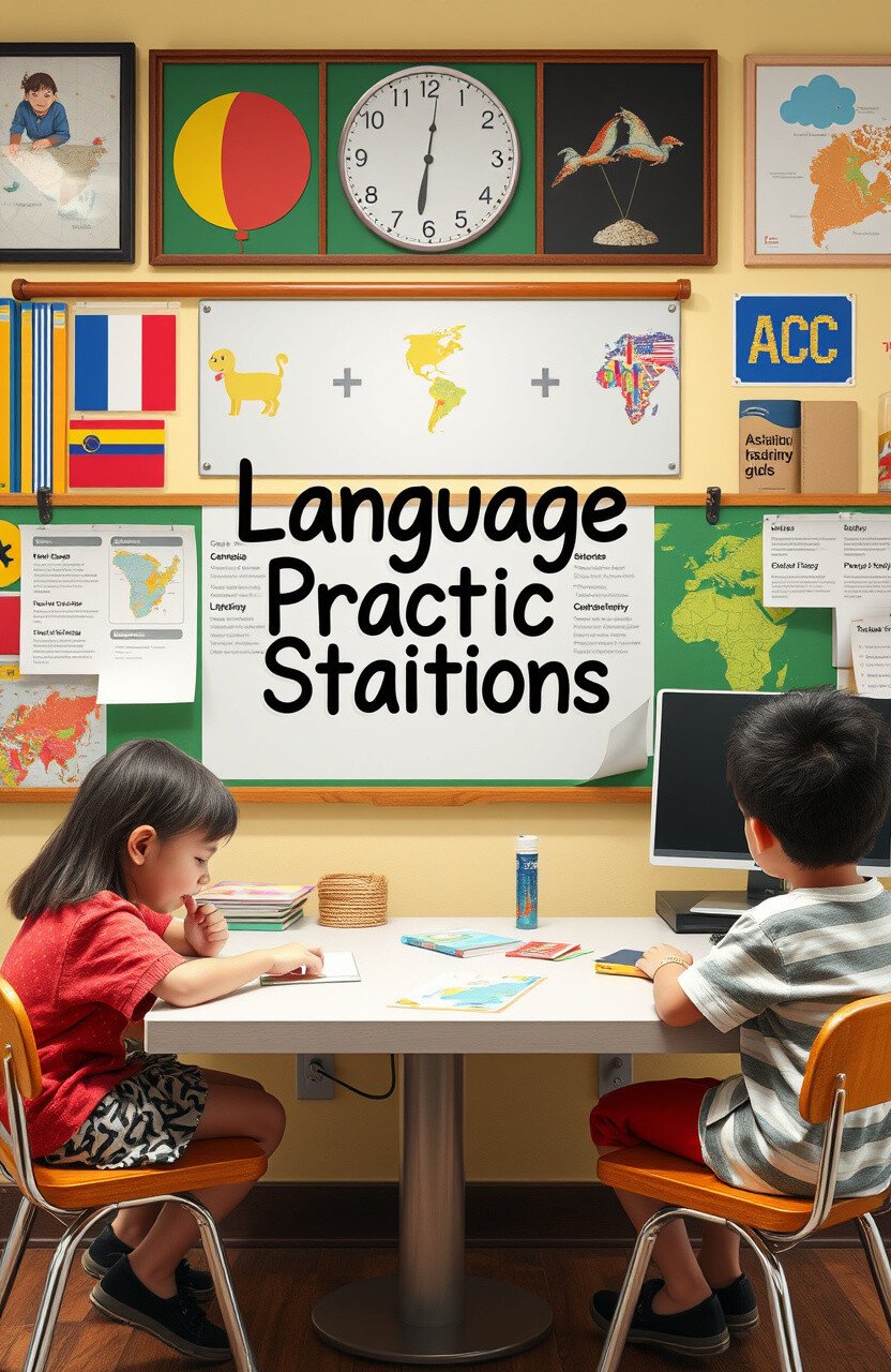 Language practice stations invite students to engage in language activities. Imagine a space where they can practice new languages.