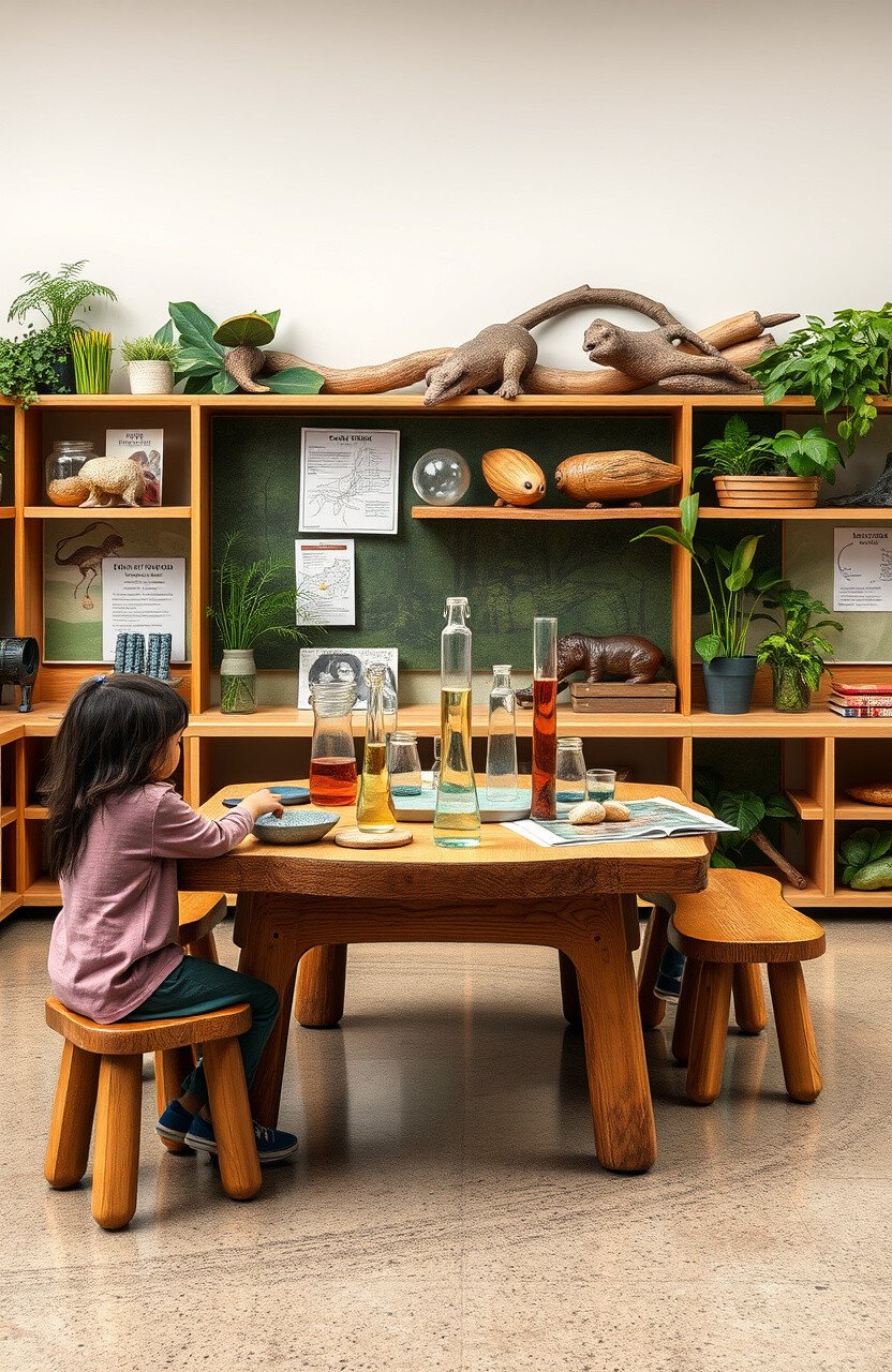 Science and nature discovery stations invite students to explore the natural world. Picture a space filled with natural artifacts and science experiments.
