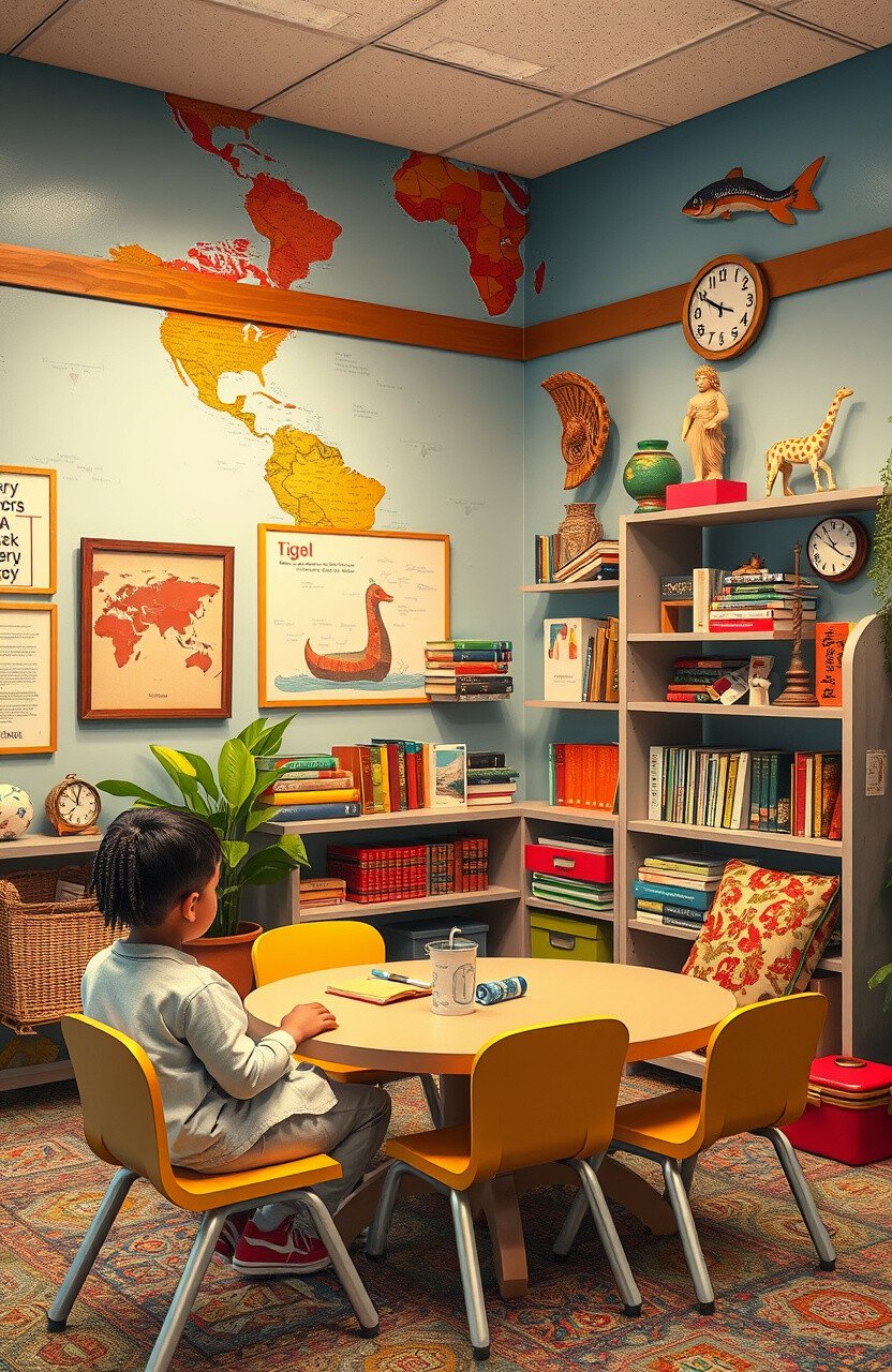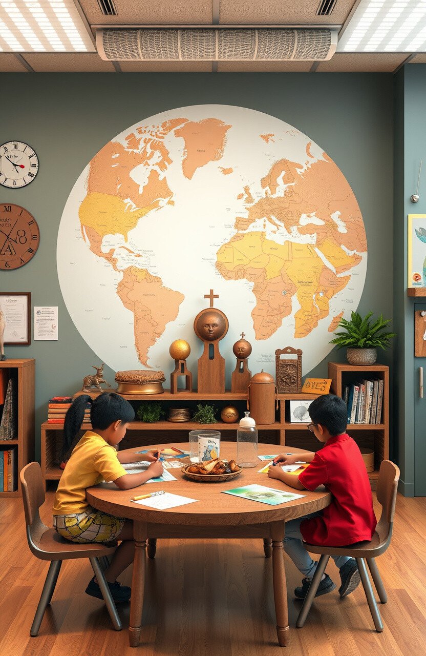 Cultural exploration tables invite students to learn about different cultures. Imagine a space filled with artifacts and stories from around the world.