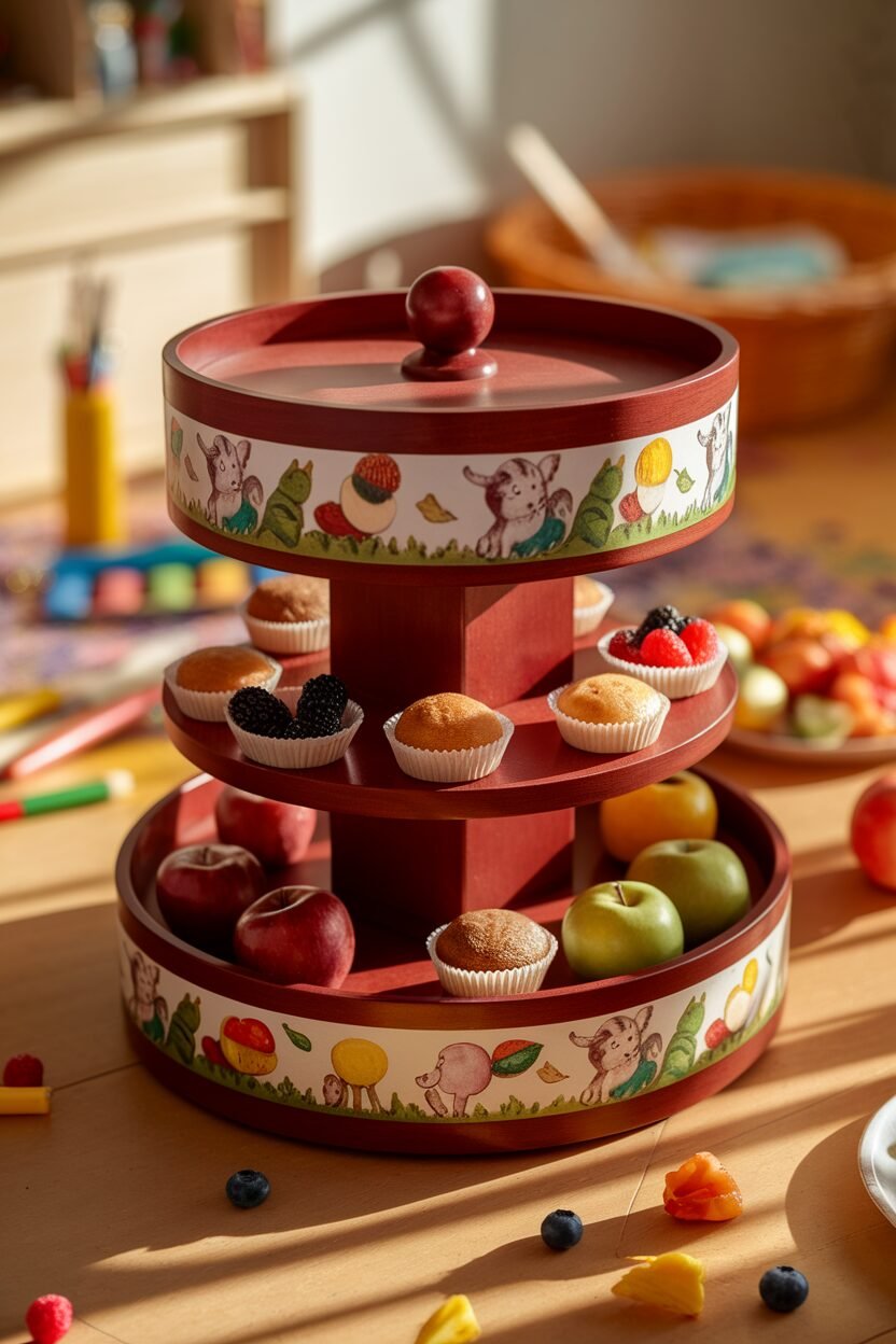 A rotating snack station is a fun way to organize healthy snacks. It’s perfect for after-school munchies.