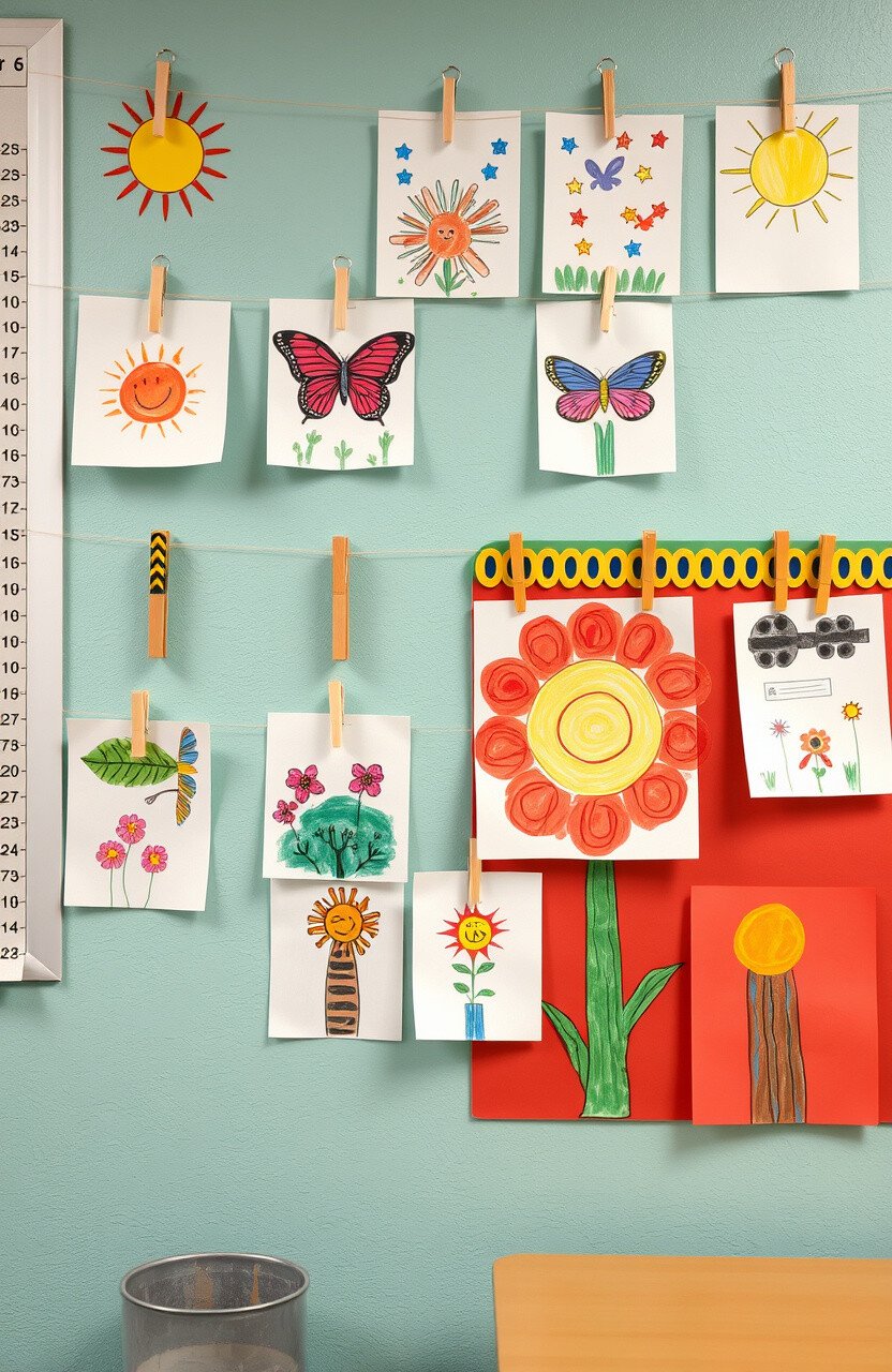 Showcase student artwork on dedicated walls or strings with clips. This not only decorates the classroom but also boosts confidence and creativity.