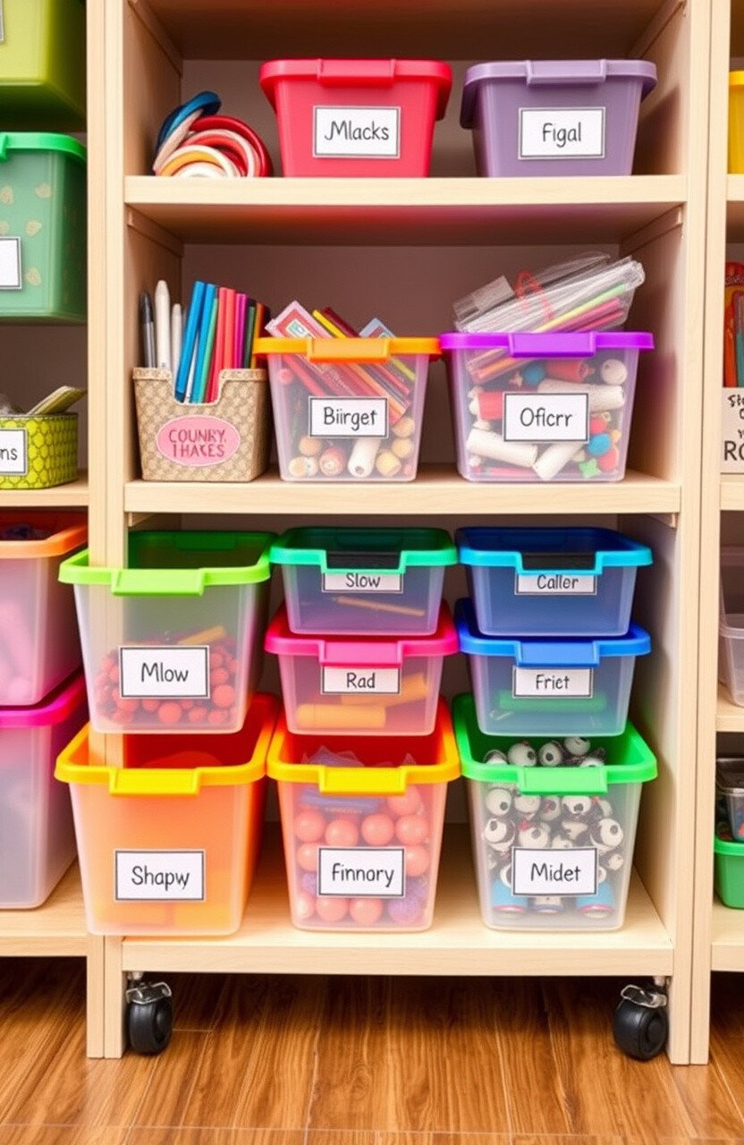 Trends include clear bins with colorful lids for easy identification. Let students help organize the bins to build responsibility.