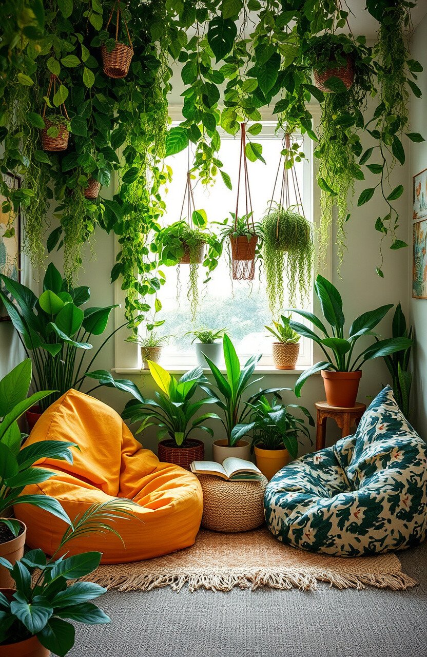 Create a jungle-themed nook with plants and bean bags. It’s a refreshing space for nature lovers.