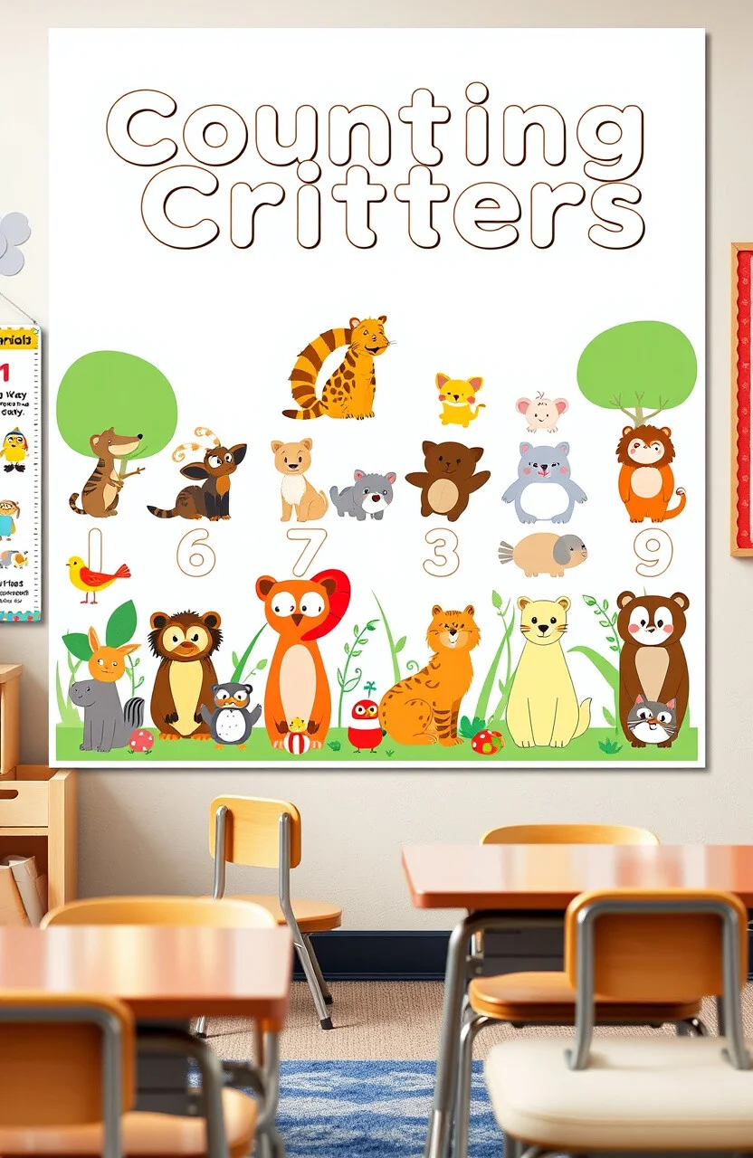 Imagine a poster filled with cheerful critters helping children learn to count. Each number is represented by a group of animated animals.