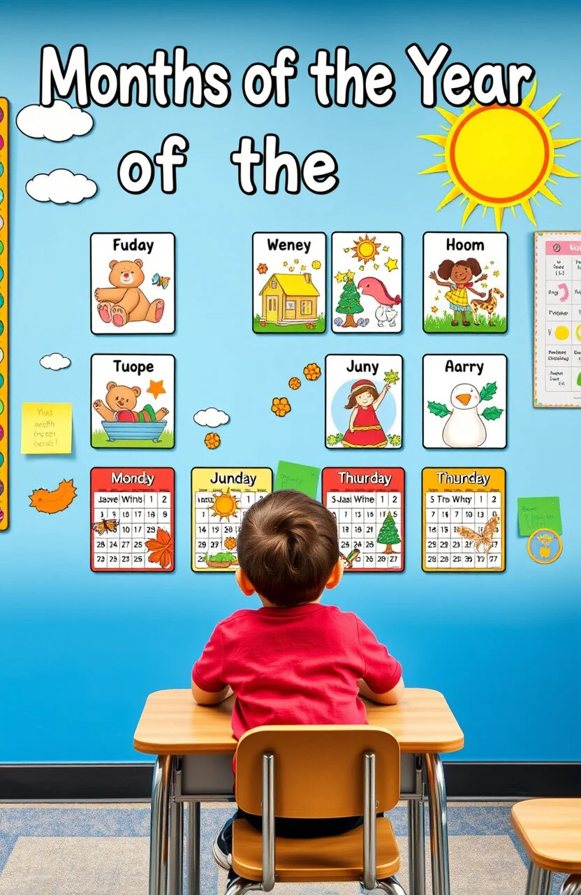 These posters make learning months interactive and fun. Each month is depicted with themes like holidays or seasonal changes.