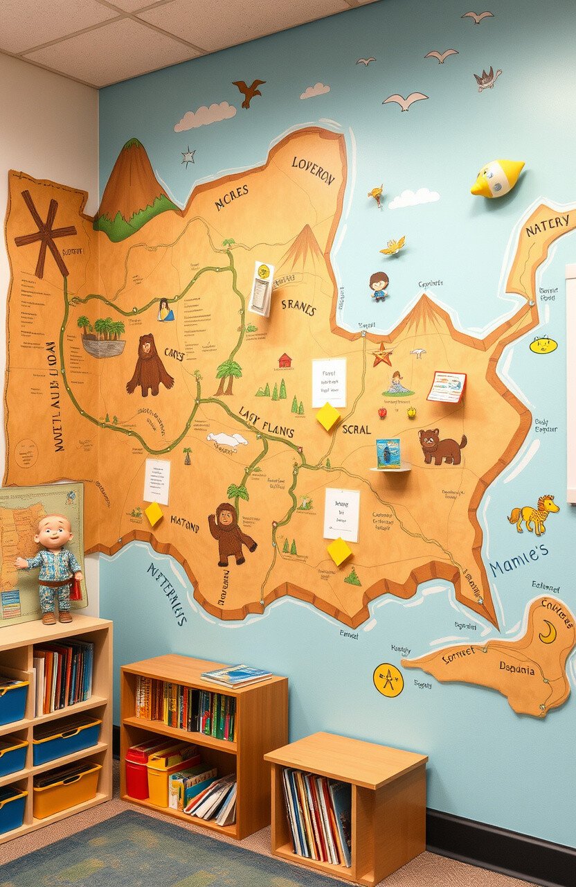 A wall with a large map or adventure path can track characters’ journeys. Kids can follow along or create new adventures.