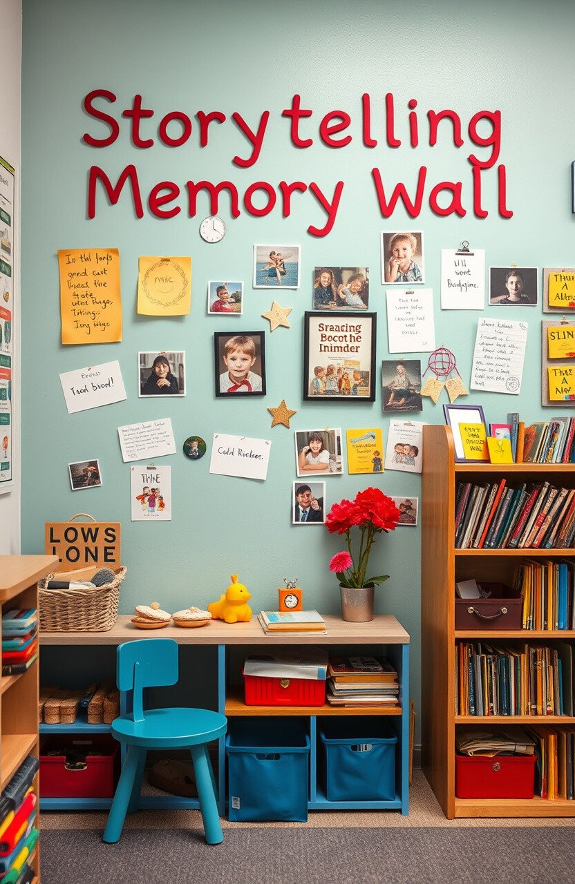 A wall dedicated to storytelling memories can include photos, quotes, or achievements. It celebrates past storytelling adventures.