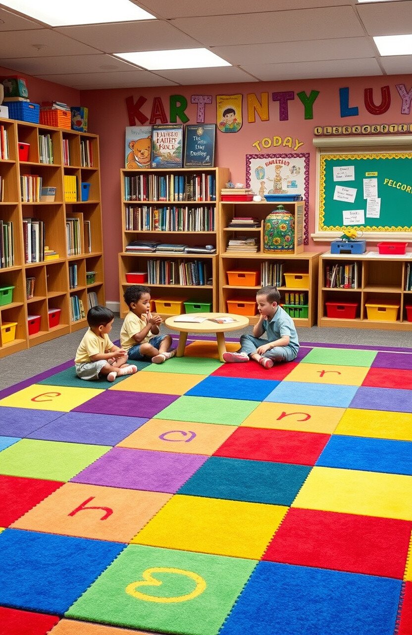 Individual carpet squares can be arranged to create a flexible storytelling space. They offer comfort and define personal space.