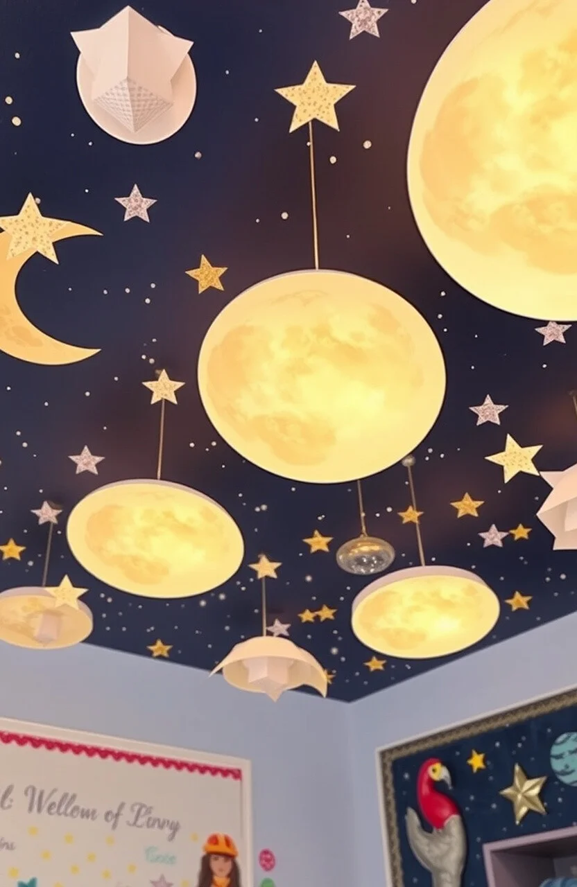 This decoration adds a warm glow to the classroom, perfect for storytime or quiet reading. It’s like a little piece of the cosmos right above.