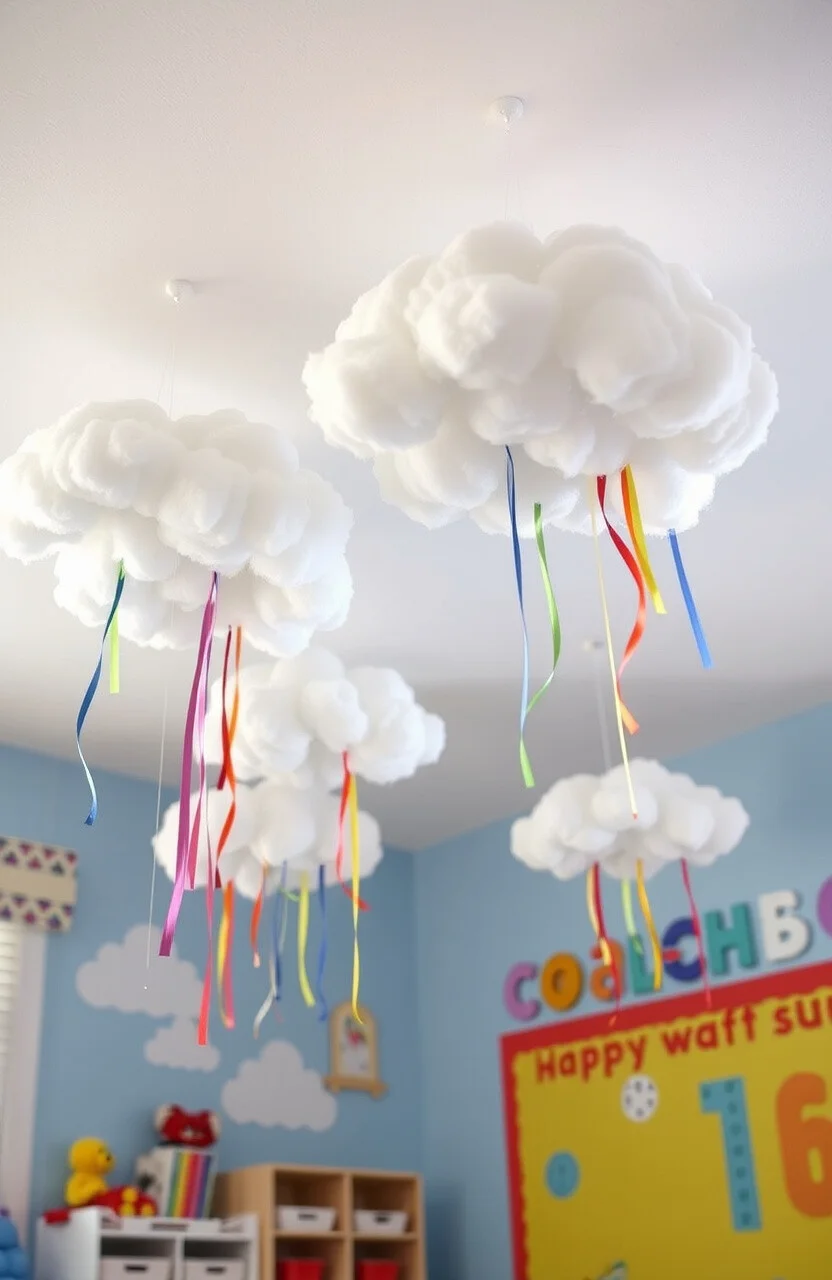 Customize the clouds by adding tiny raindrops or rainbow ribbons. Secure them from the ceiling with clear fishing line for a magical floating illusion.