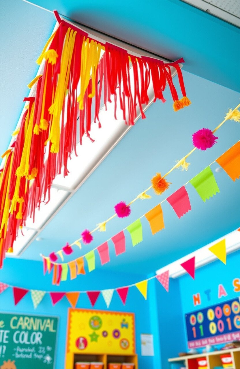 Transform the classroom into a lively carnival with colorful bunting and streamers. Use bright fabrics to create a festive atmosphere.