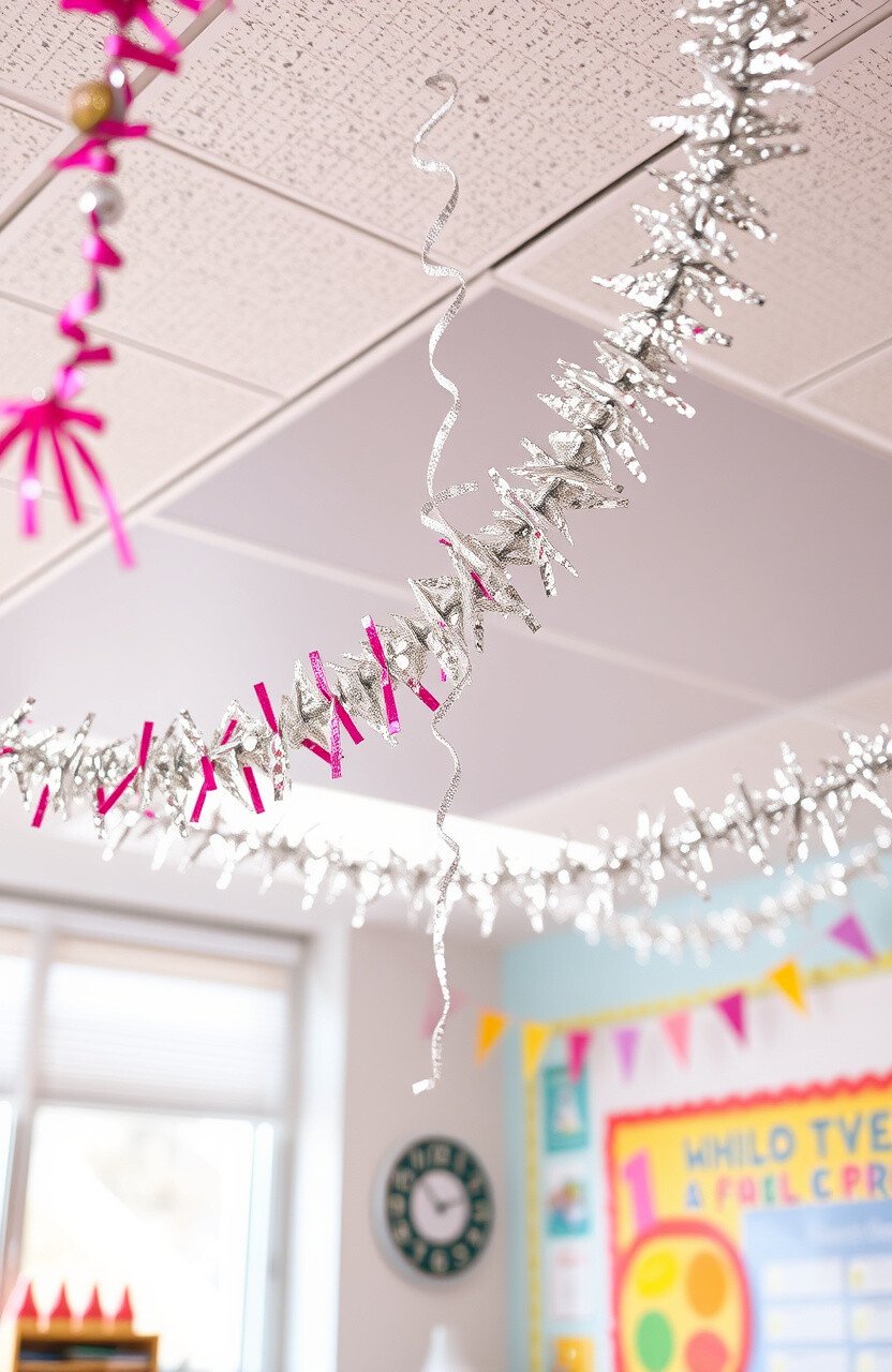 String glittering garlands across the ceiling for a sparkling and festive display. Use foil or fabric to create these shimmering decorations.