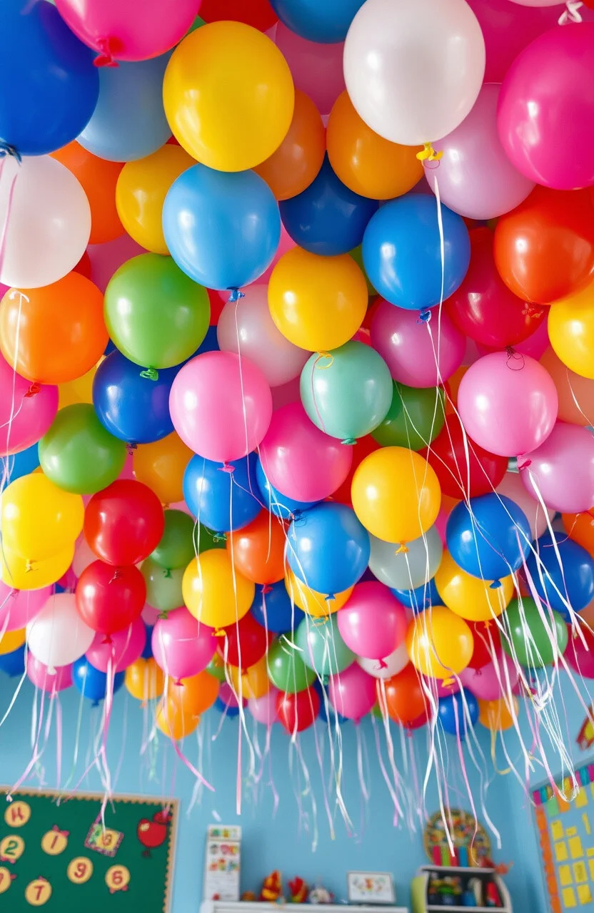 Fill the ceiling with colorful balloons for a festive and fun atmosphere. Use helium balloons to create a floating wonderland.