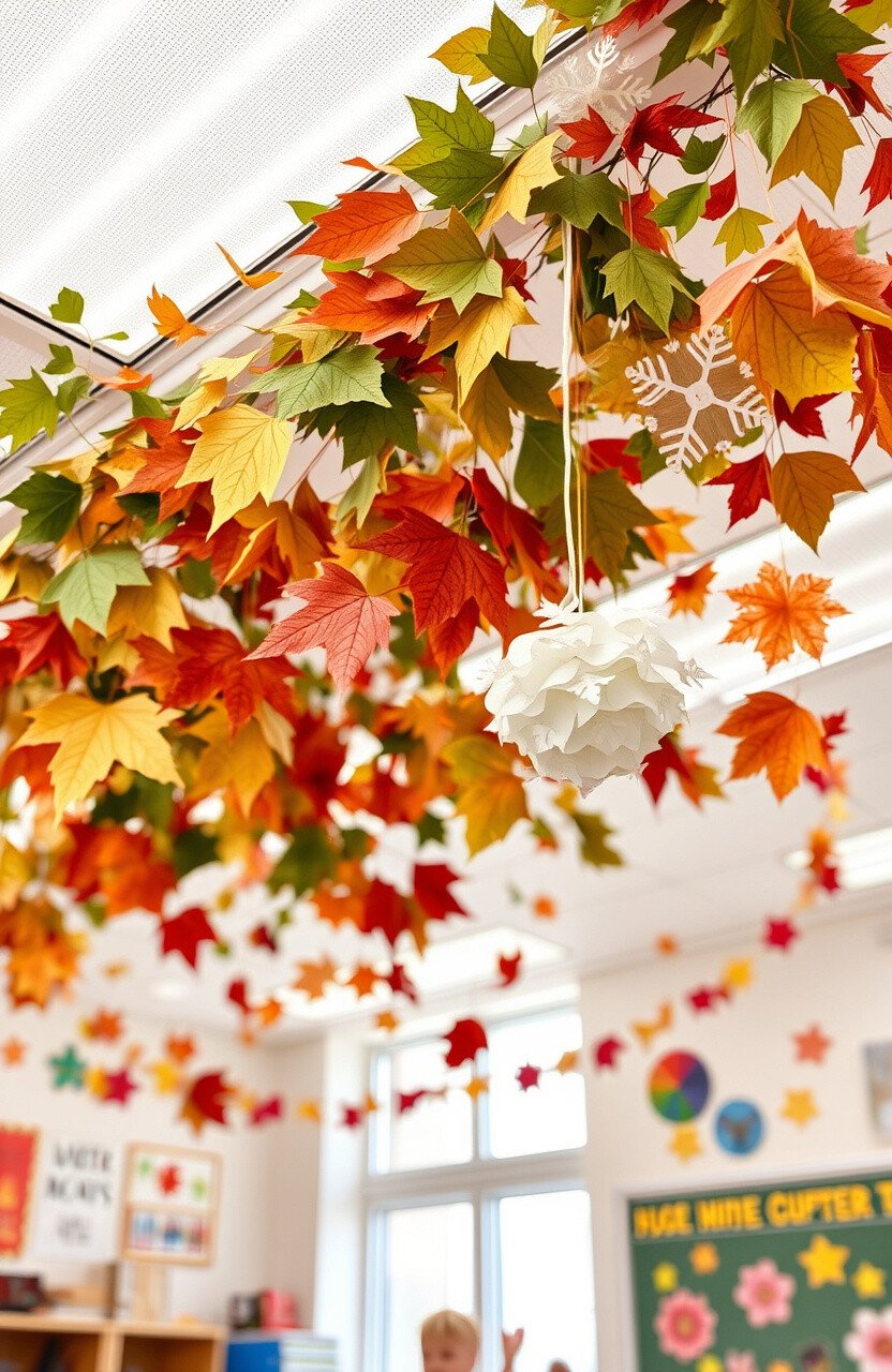 Change the ceiling decor with the seasons using leaves, snowflakes, or flowers. Use paper or fabric to create these seasonal displays.