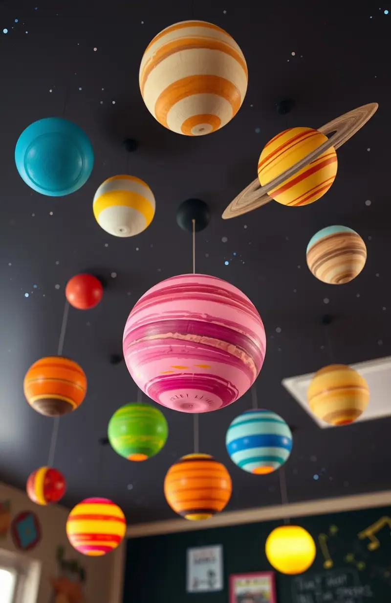 Turn the ceiling into a mini solar system with colorful planets orbiting above. Use foam balls painted in vibrant colors to represent each planet.
