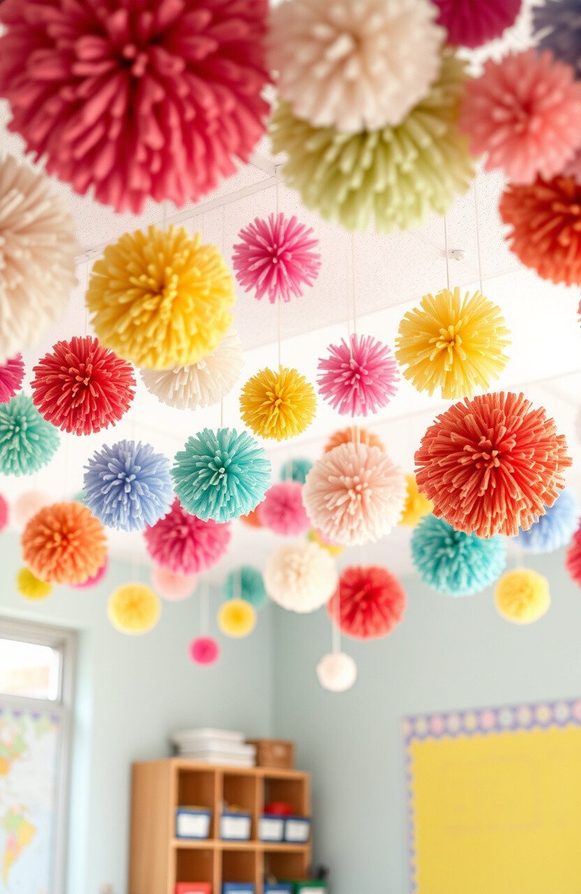 Fill the ceiling with colorful pom-poms for a fun and textured display. Use yarn or fabric to create these playful decorations.