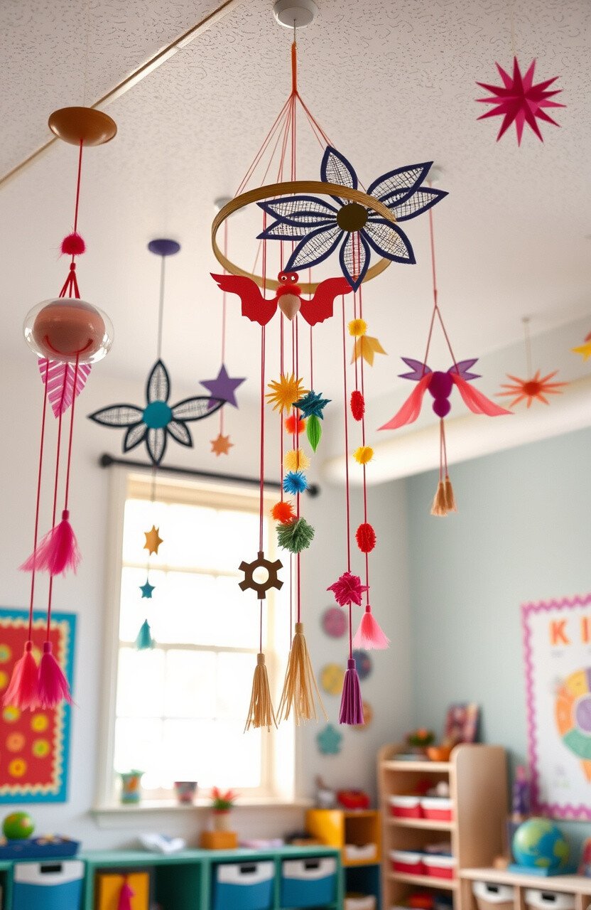 Hang whimsical wind chimes from the ceiling for a musical and decorative display. Use colorful materials to create these delightful ornaments.