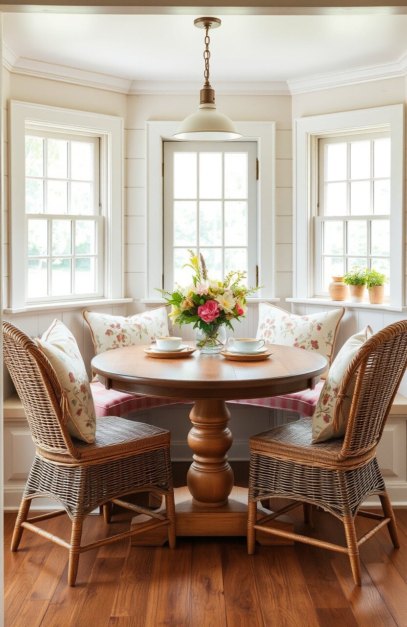Farmhouse style nooks bring a rustic charm with wooden tables and vintage chairs. It creates a warm, welcoming atmosphere.
