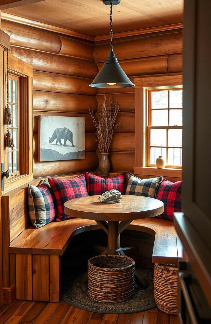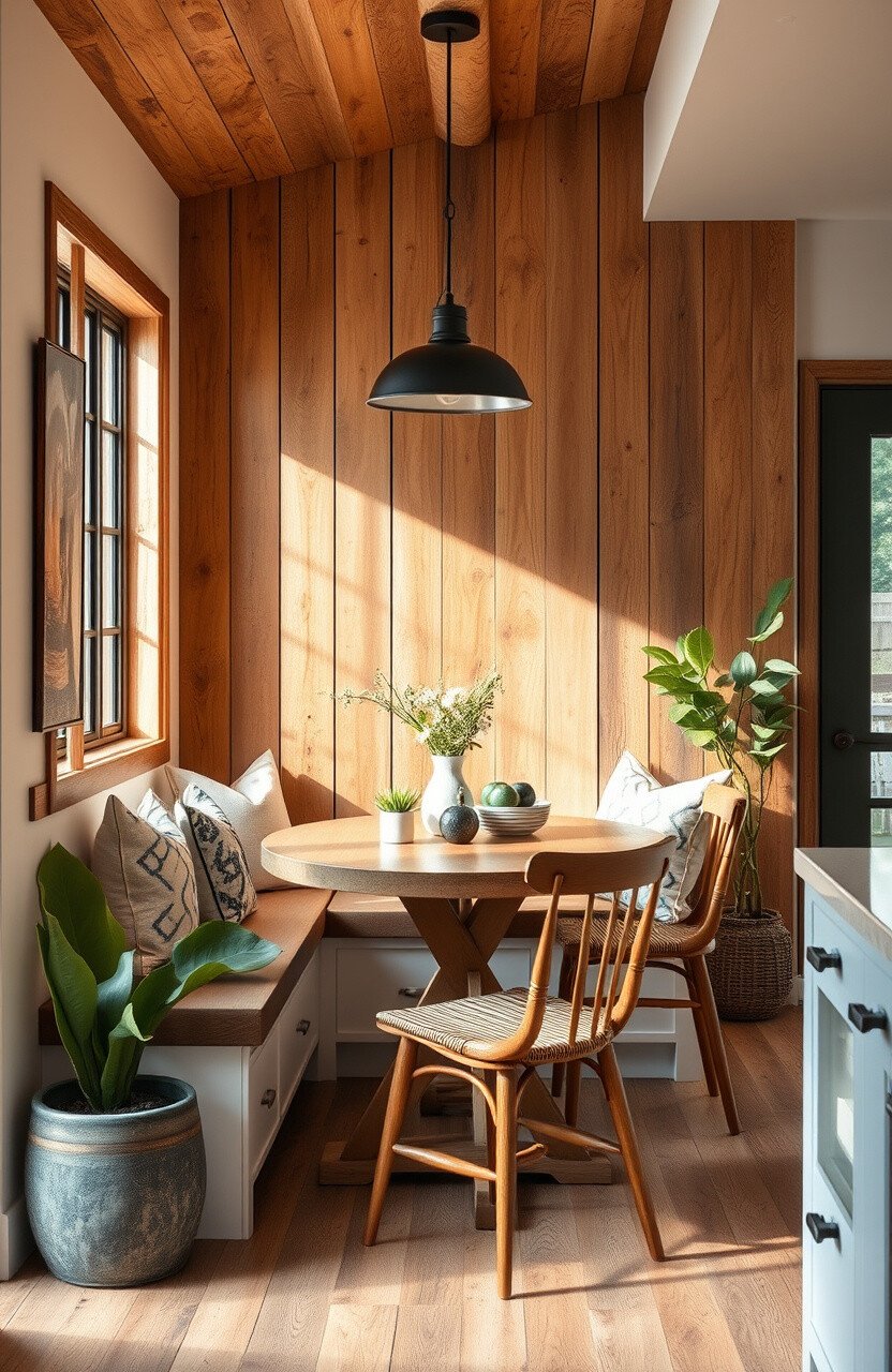 Create a cozy retreat with a rustic cabin-style nook full of warm woods and earthy tones. It’s like a breakfast hideaway.