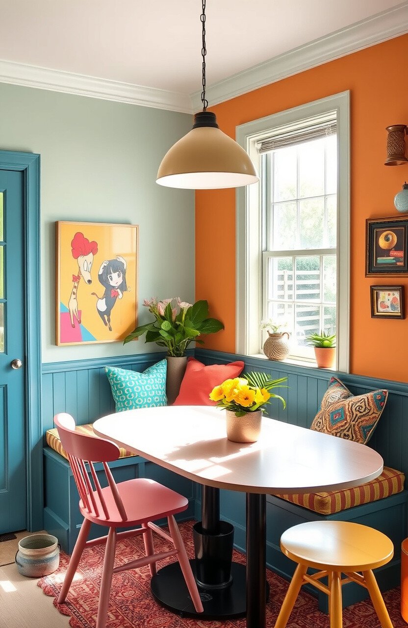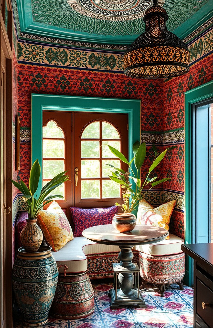 A bohemian breakfast nook is vibrant and eclectic, filled with colorful textiles and patterns. It’s a joyful spot that celebrates individuality.