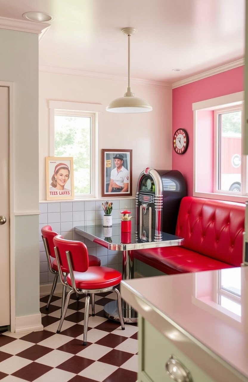 Step back in time with a retro diner nook featuring bright colors and chrome accents. It’s a fun, nostalgic setting.
