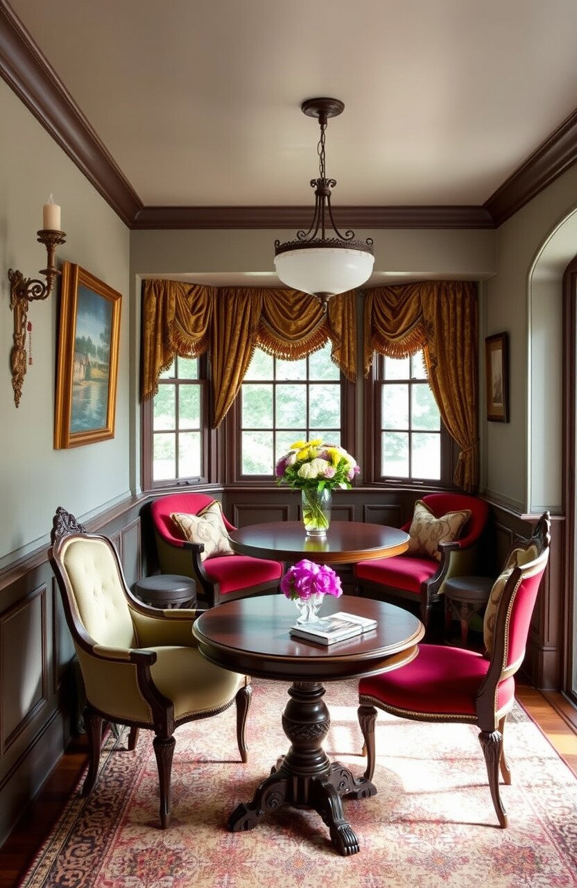 Step back in time with an elegant Victorian nook featuring ornate furnishings and rich colors. It’s a regal way to start the day.