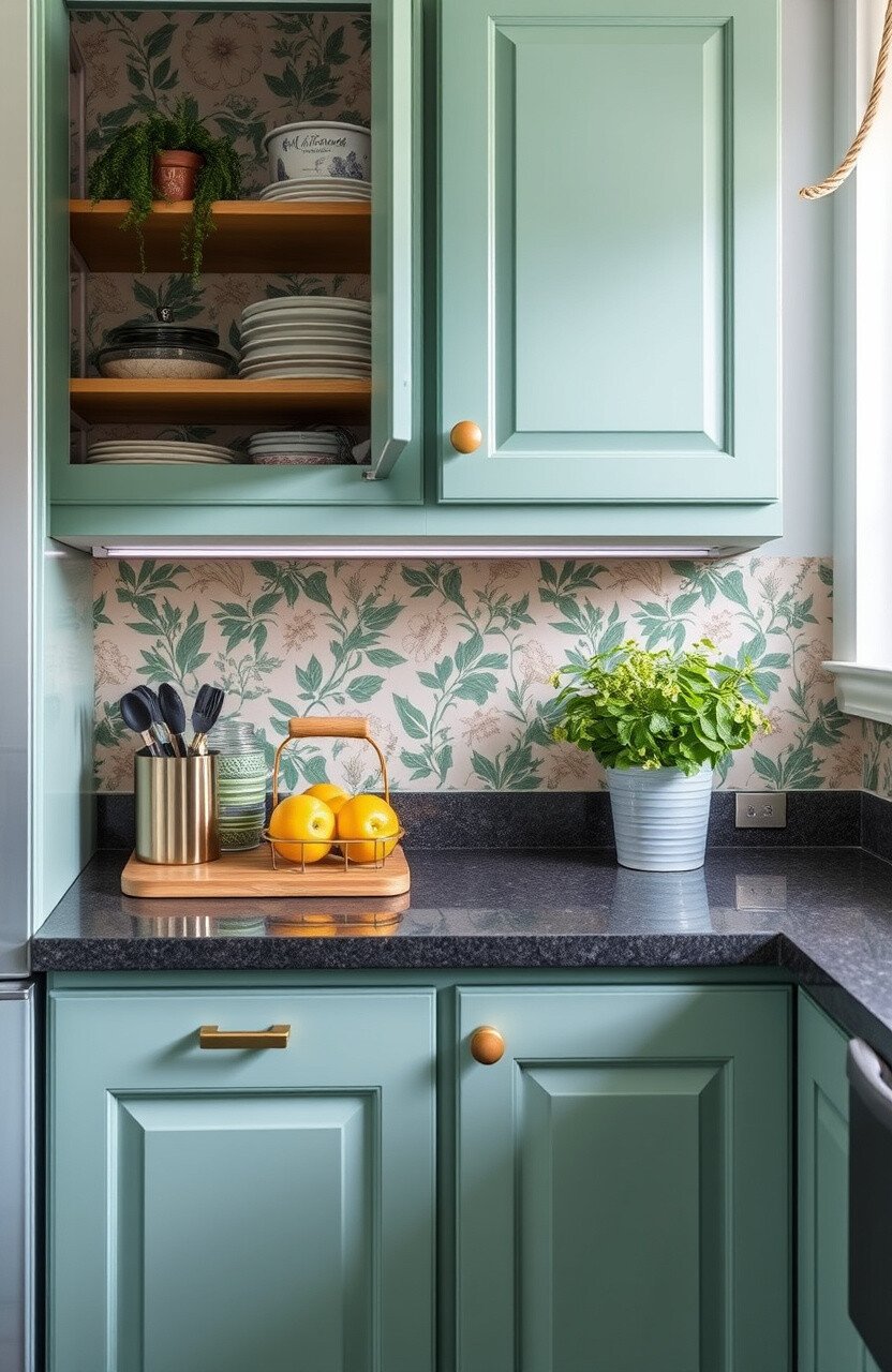 Costs are low since you won’t need much wallpaper. It’s a simple DIY project that adds a delightful touch to your kitchen.