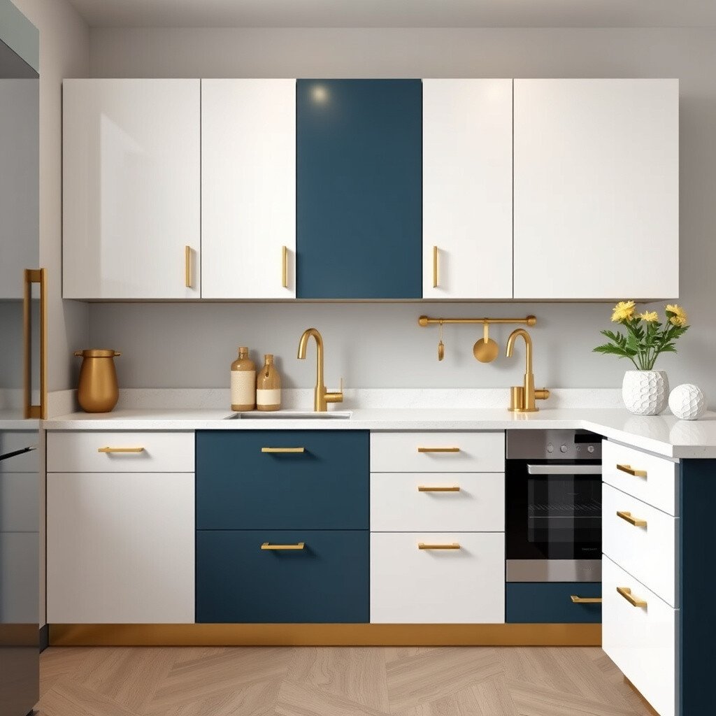 This look is perfect for those who want a dynamic and modern kitchen. The gold details add a touch of elegance, making the two-tone design feel cohesive and stylish.