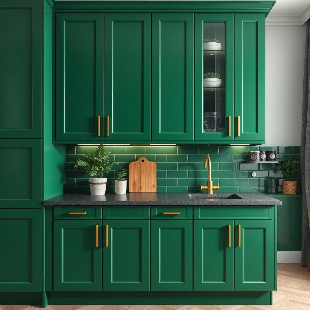 Emerald green cabinets are a bold, refreshing choice that can make your kitchen feel lively and inviting. Gold hinges add a sophisticated touch, enhancing the luxurious feel of the green color.