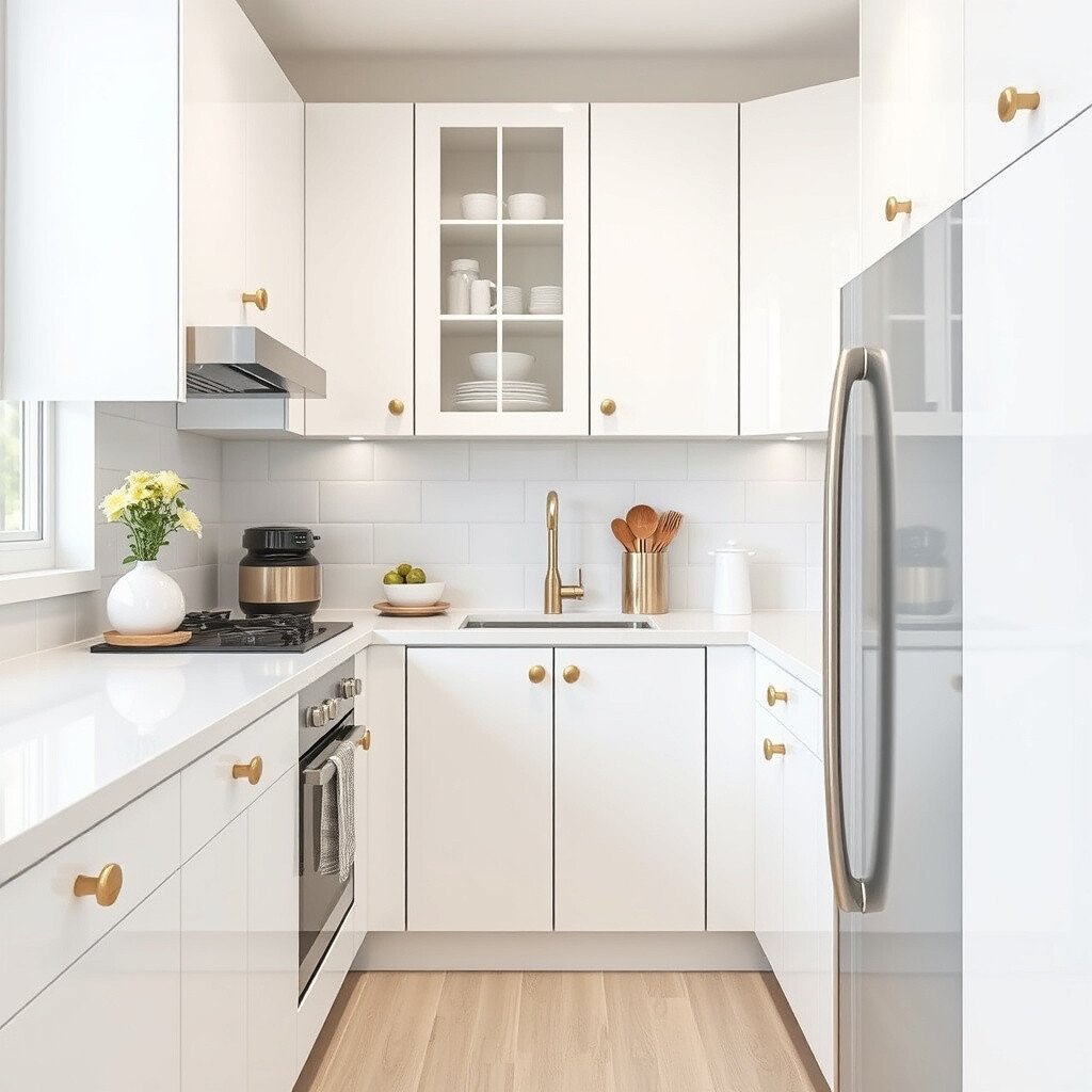 Glossy white cabinets paired with gold knobs create a clean and bright look. The shine from the gloss reflects light, making your small kitchen feel larger and more open. Gold knobs add a touch of luxury without overwhelming the space.
