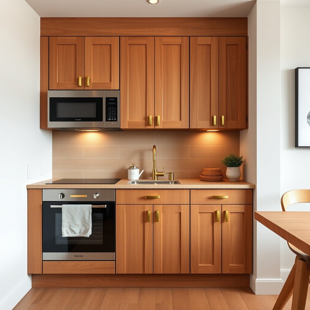 Warm wood tones create a cozy and inviting atmosphere in a kitchen. Gold handles add a luxurious contrast, making the wood grain pop even more.