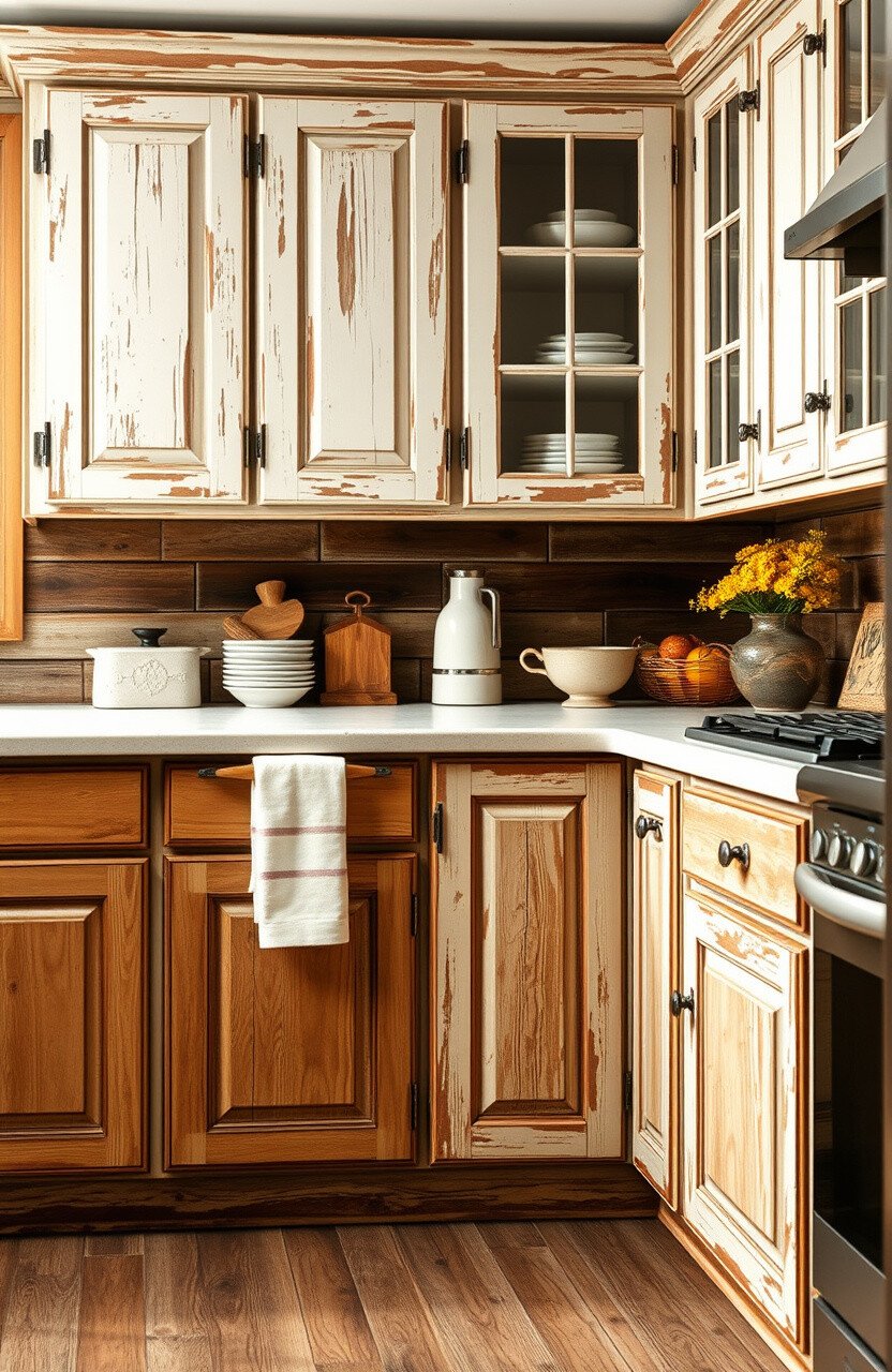Distressed cabinets give a shabby chic vibe. They look lovingly worn and full of character.