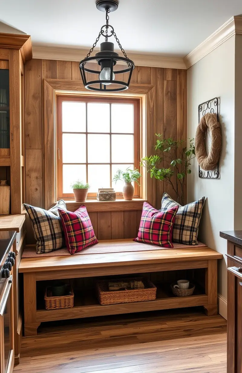 Add a wooden bench with plaid cushions. It’s both cozy and stylish.