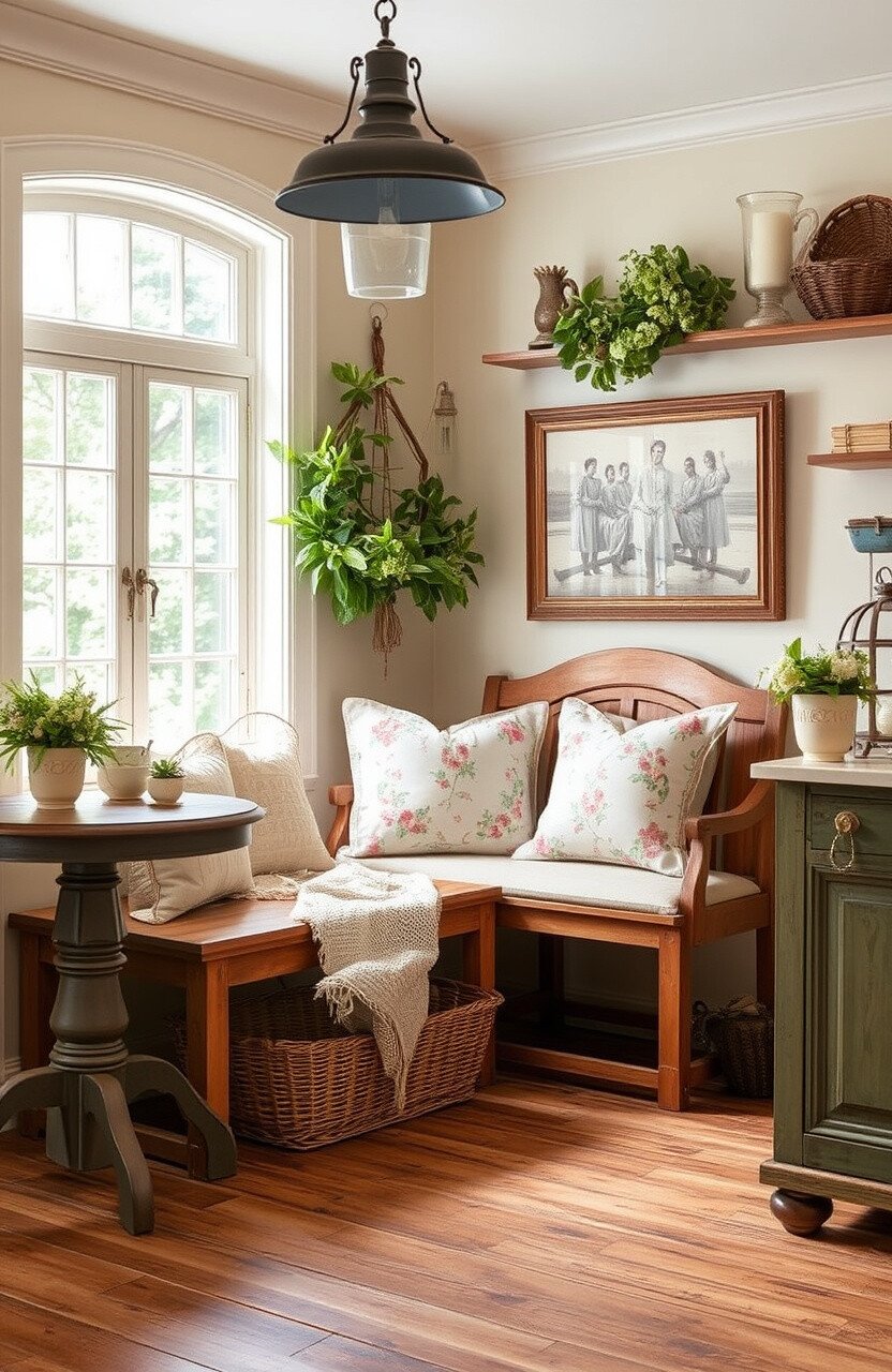 Use pastel shades and worn finishes. This creates a cozy and inviting look.