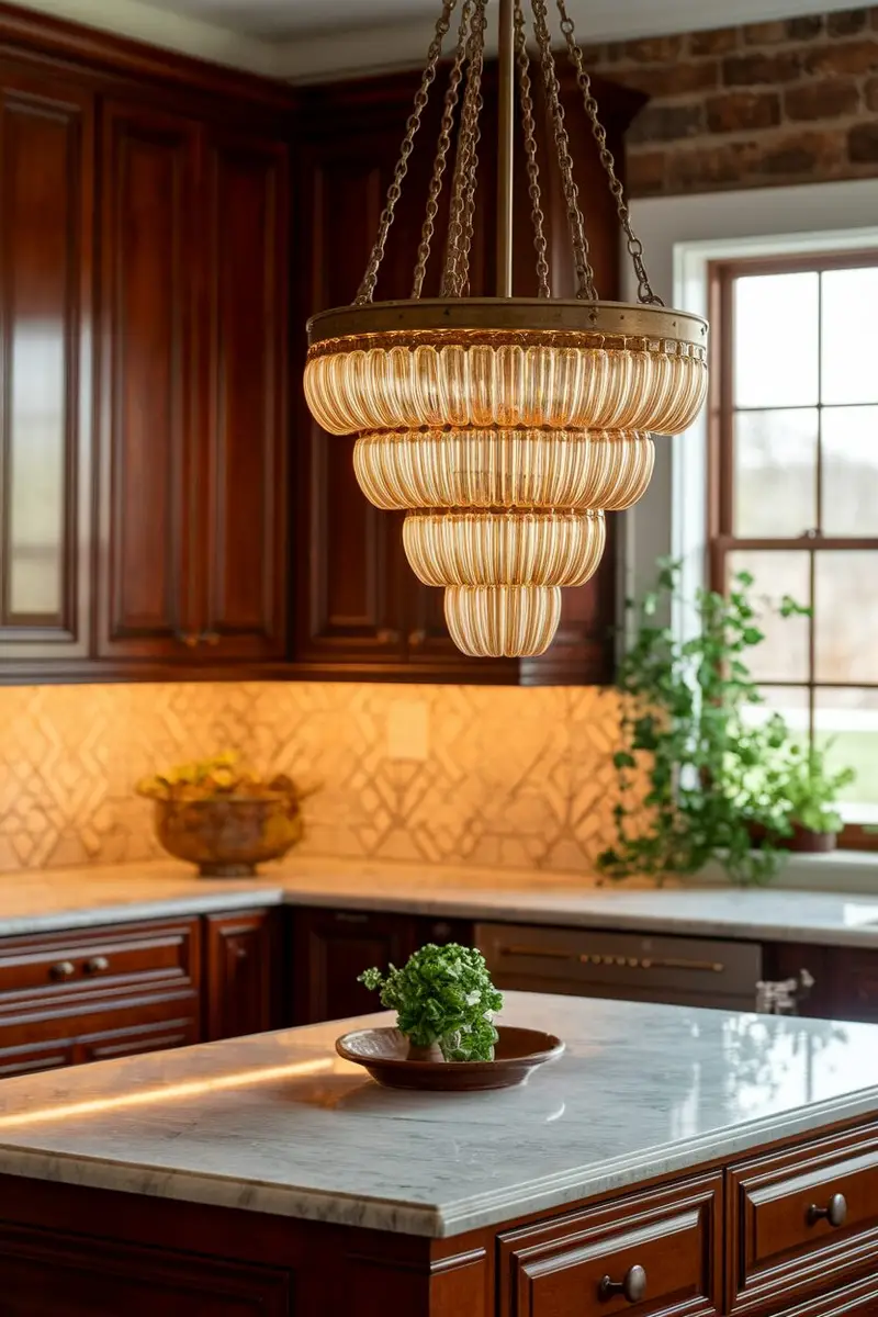 Statement lighting adds drama and elegance. It can become a focal point in your kitchen.