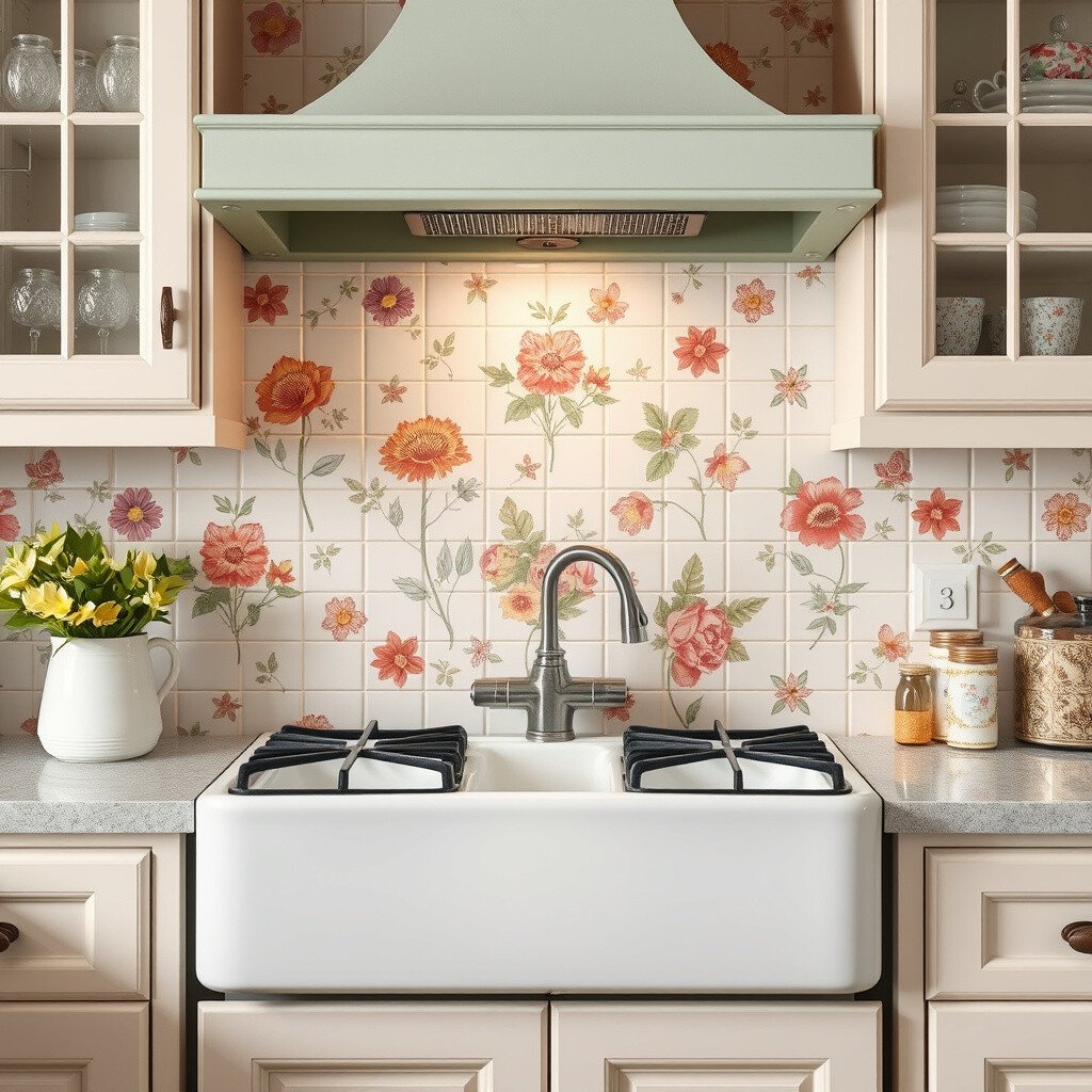Floral tiles bring a touch of vintage charm and whimsy. Perfect for a cottage or shabby chic kitchen.