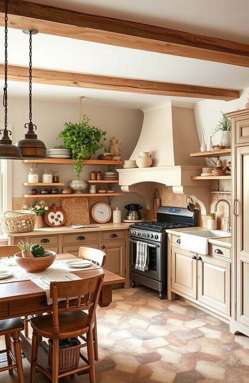The idea is to mix practicality with aesthetics. Use the shelves for both storage and decoration. Vintage plates, colorful mugs, or cookbooks can add personality.