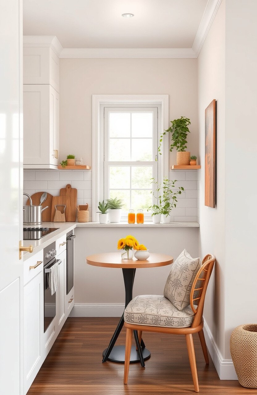 The benefit here is its compact design that maximizes space without feeling cramped. Add a window nearby for natural light to flood in, creating an inviting atmosphere. It’s a charming way to personalize your space with colorful cushions or a vibrant tablecloth.