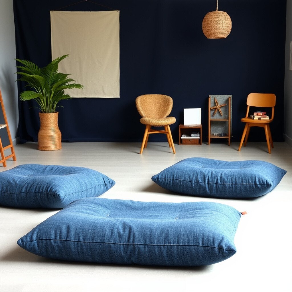 Inspire your creative side with a studio space featuring denim floor cushions. They’re great for brainstorming sessions or relaxed meetings.