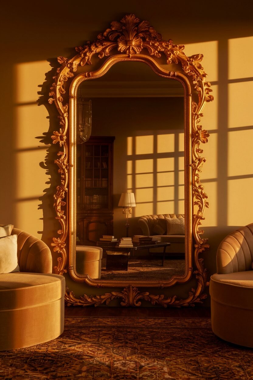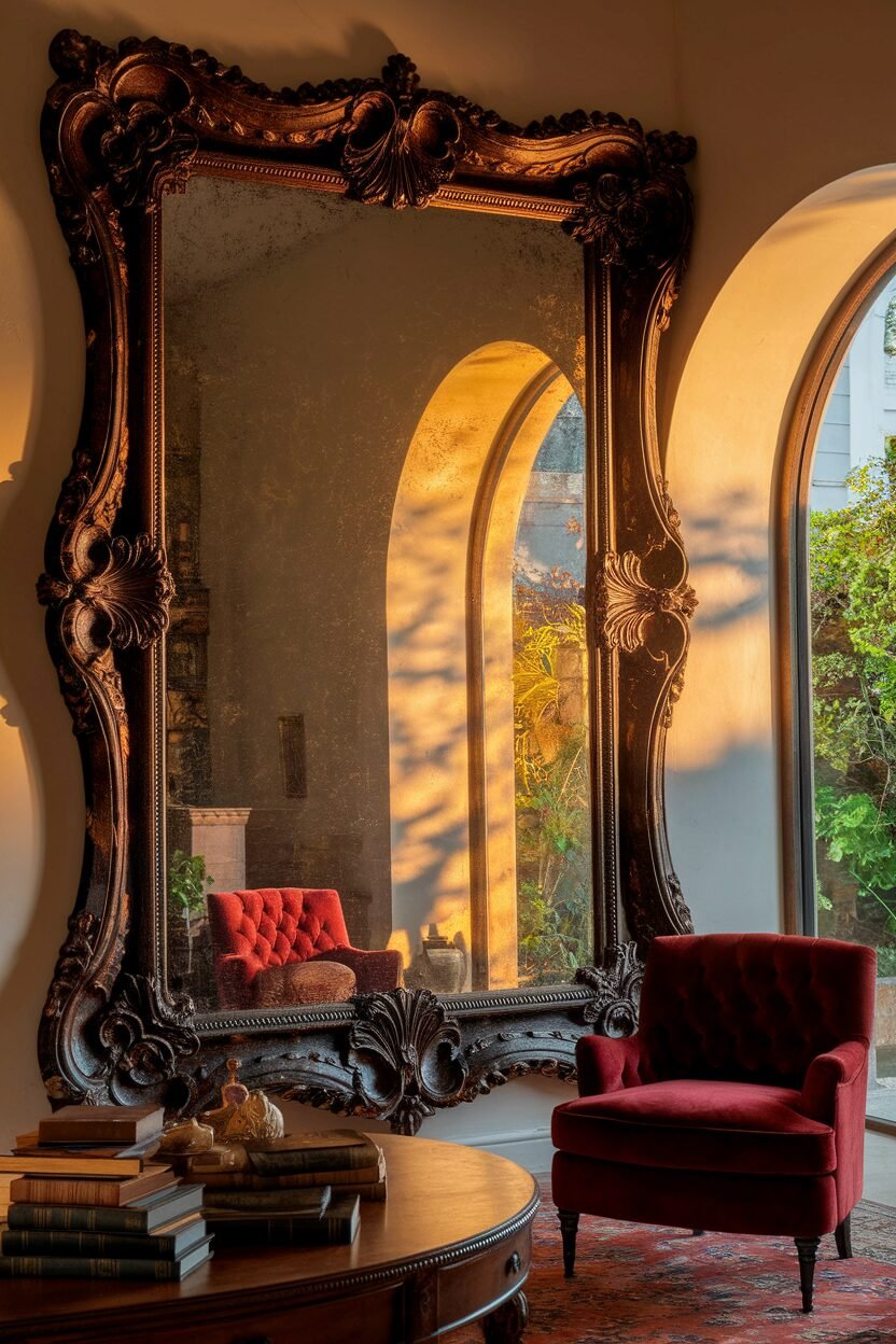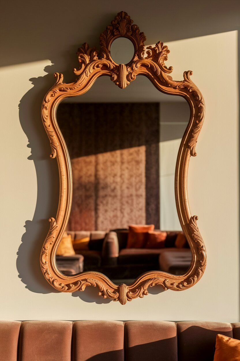 Think of a large mirror wrapped in a beautifully aged wooden frame, like a piece of art from a grand estate. Vintage mirrors have a way of adding charm and character to any space. These mirrors can make your living room feel cozy and inviting, like an old storybook cottage.