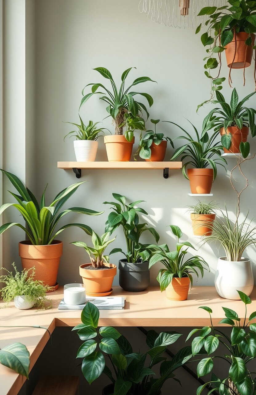 Choose low-maintenance plants like ferns or spider plants. Arrange them on shelves or hang them.