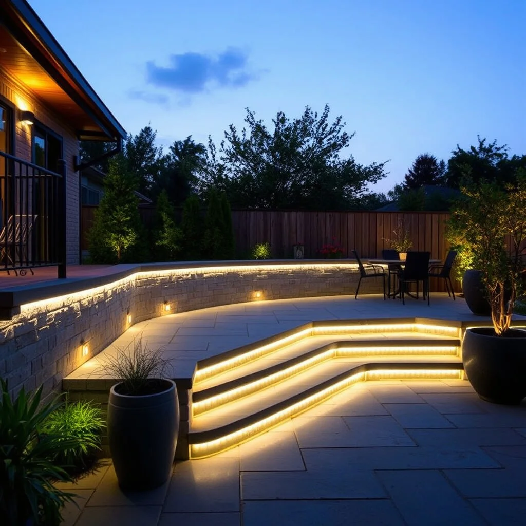 LED strip lights are versatile and can be used in many creative ways. They’re perfect for under-railings or along steps.