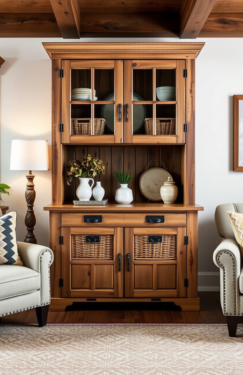 They’re perfect for a cabin or farmhouse-style living room. Rustic cabinets can be personalized with woven baskets or vintage decor pieces. They’re both functional and full of character.