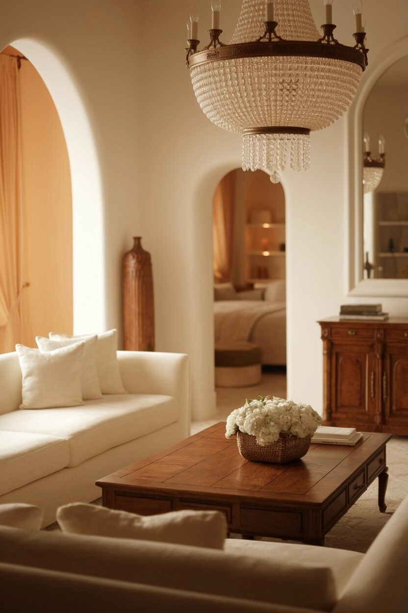 Installing a white chandelier with wooden accents can elevate your living room with a touch of elegance. This combination creates a stunning focal point that draws the eye upward.
